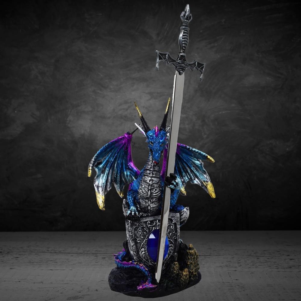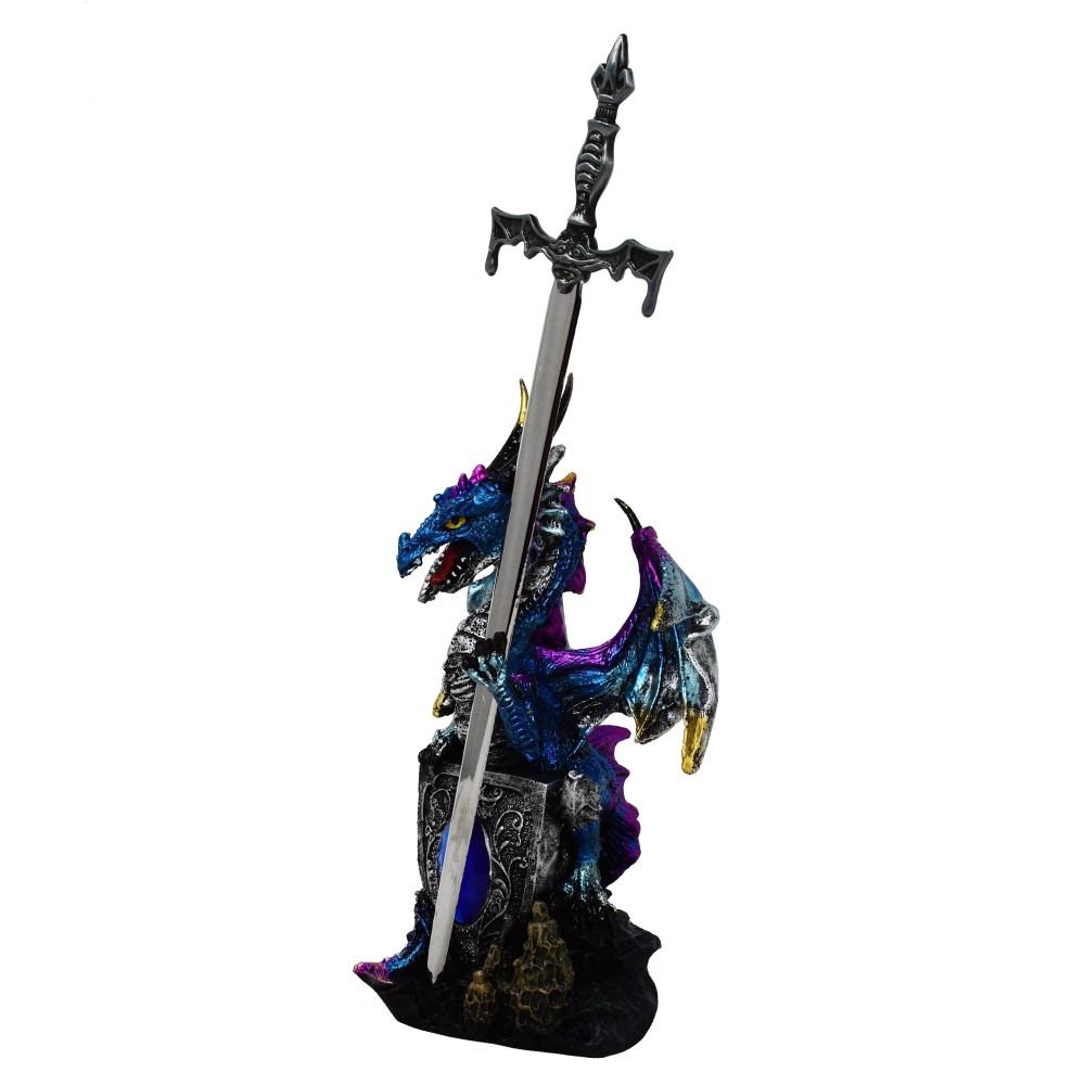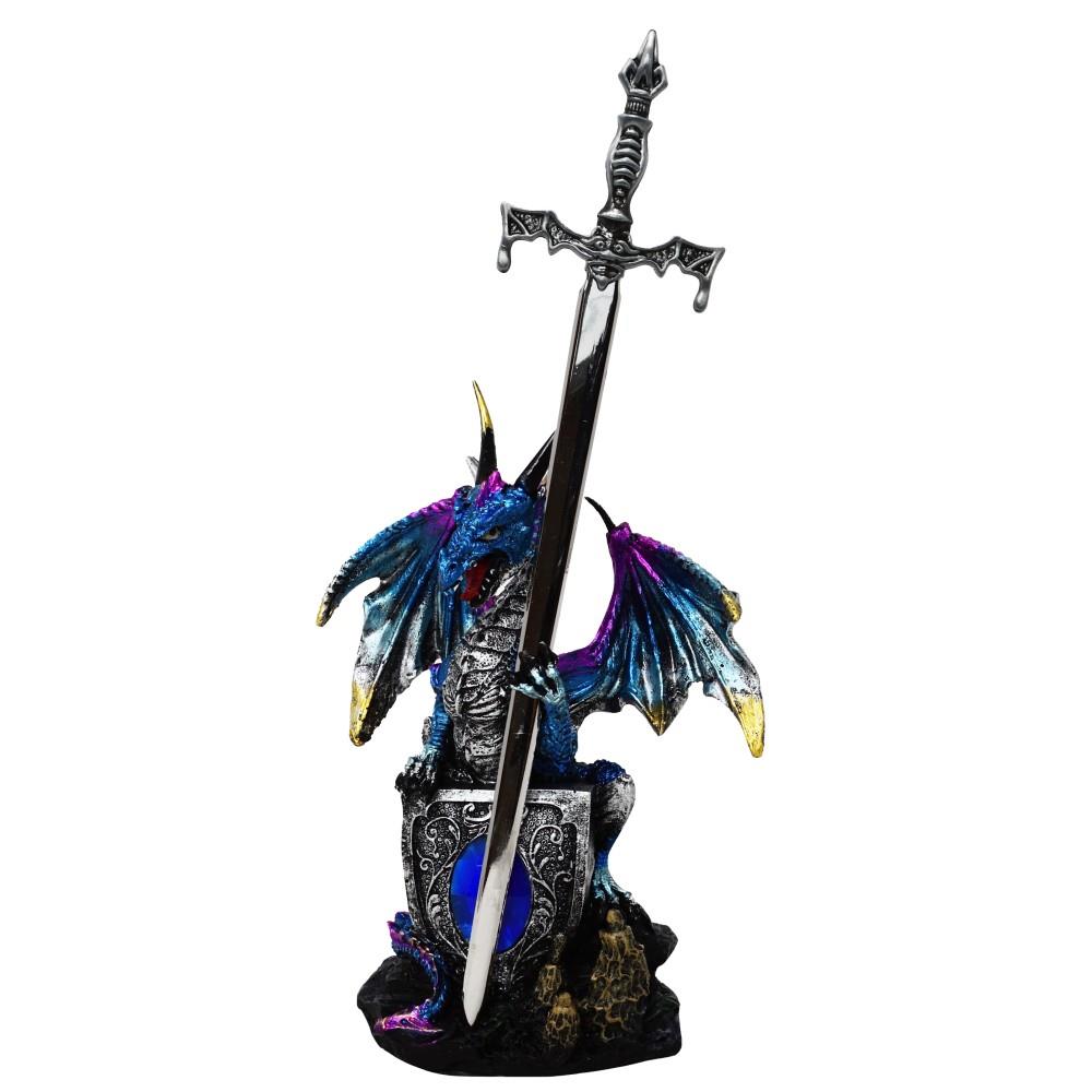 Wunderschöner und sehr detaillierter Drache mit blauem Kristall, der eín Schwert in